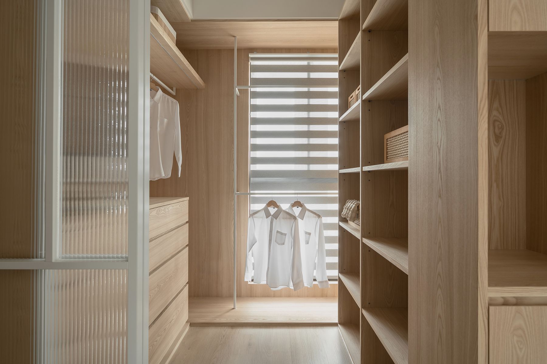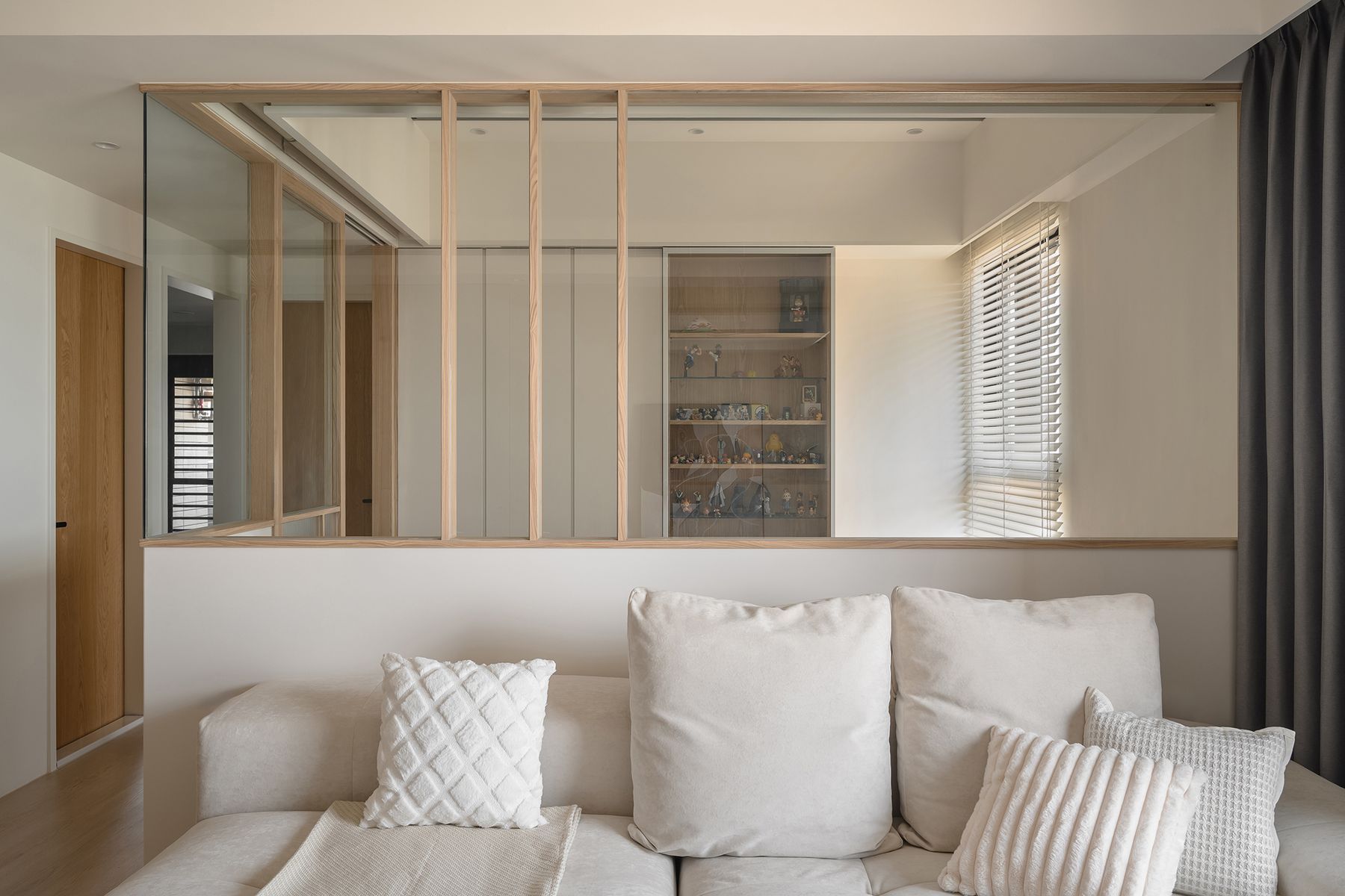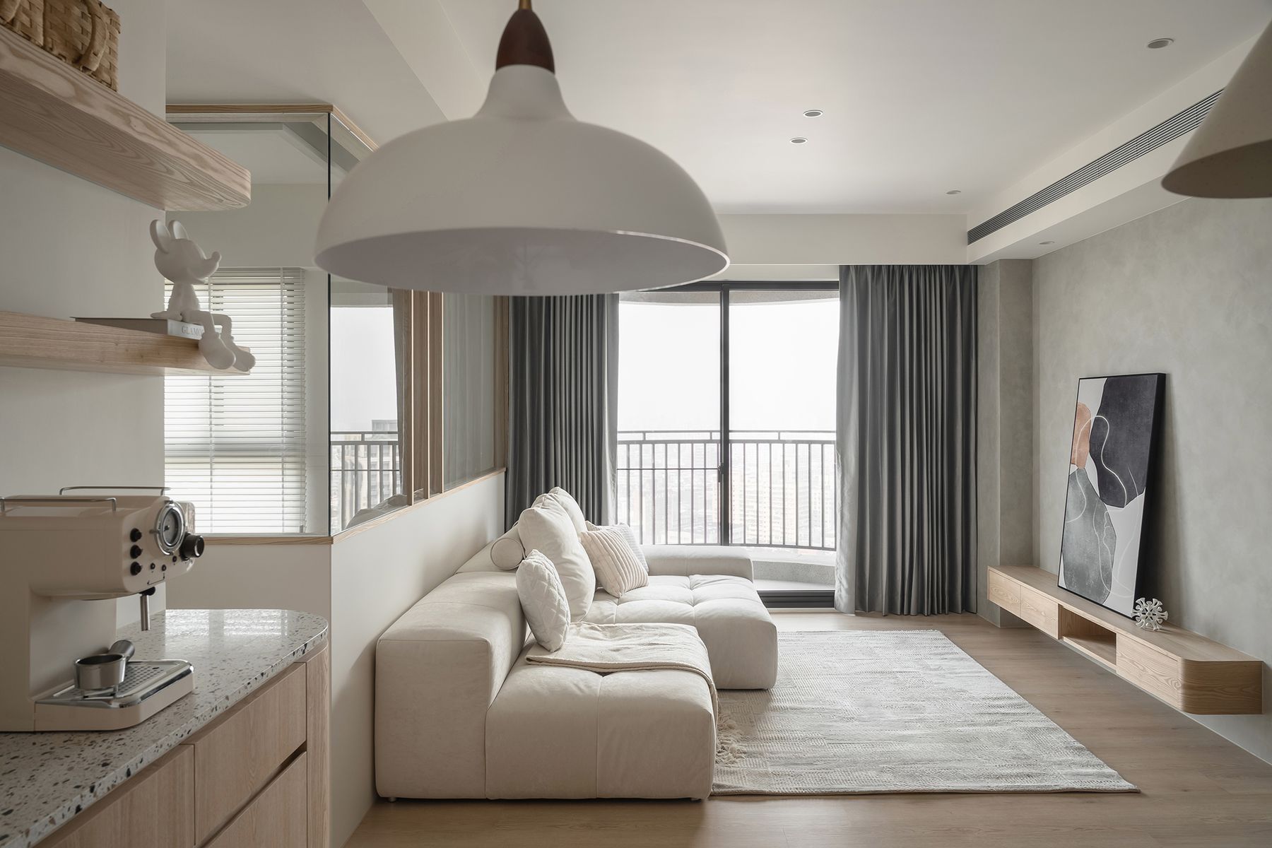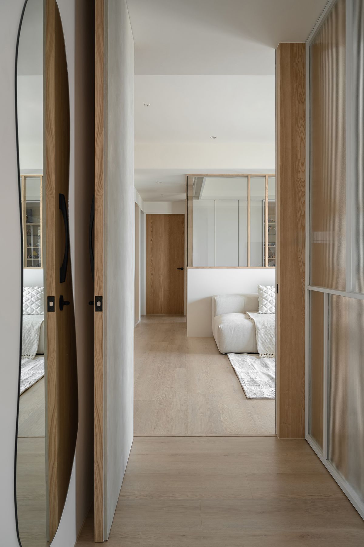 空間以溫暖的原色橡木,與大面積白色為基底,呼應起居者單純且樂活的生活態度。客廳為生活場域的中心,並依其動線前後發展出主臥室、更衣室、書房,與客房,使每個空間都得以浸泡於日光之中,將單面採光的狹長格局的劣勢化為優勢。懸吊的壁櫃、開放的層板、穿透的玻璃門片,看似「不做滿」的設計,卻使空間流動性與室內視線皆得以通透,達成高坪效的同時,更顧及小空間的視覺體感,讓居住者成為生活場域的主宰。