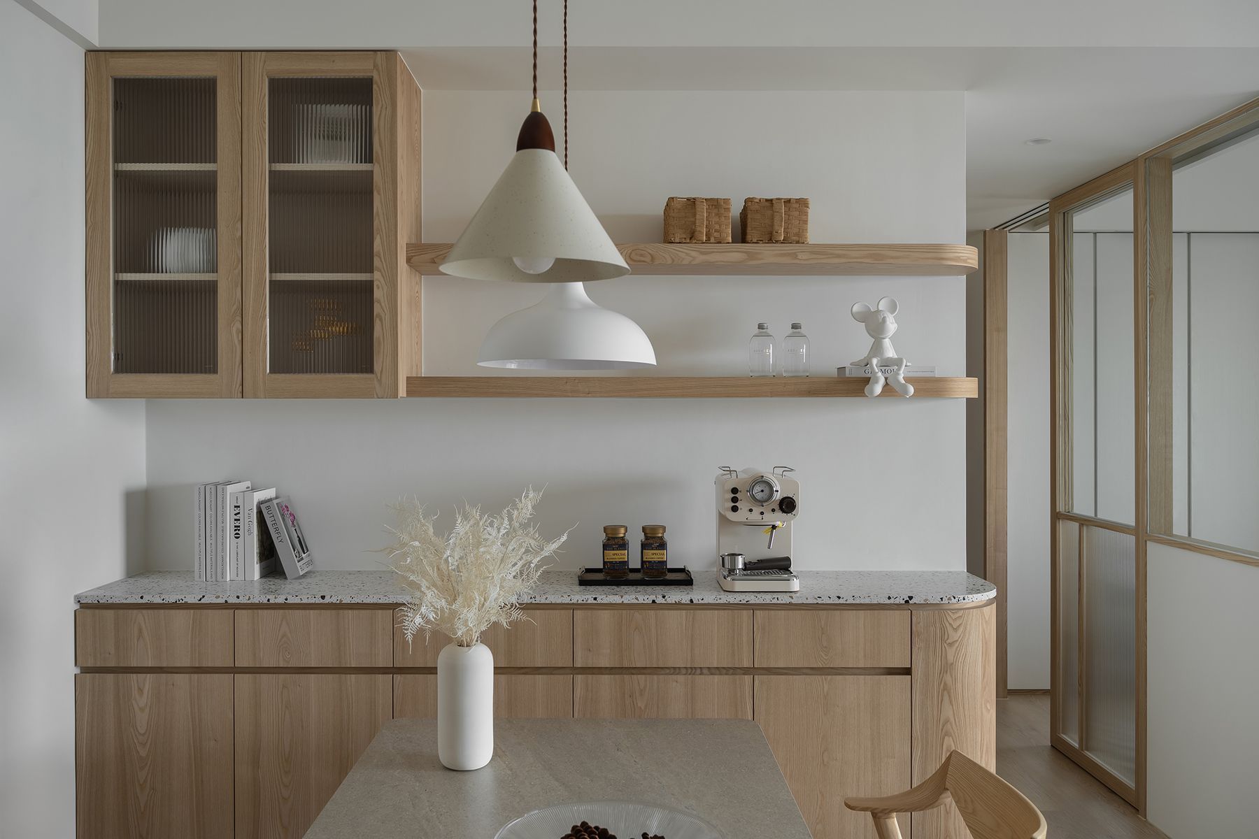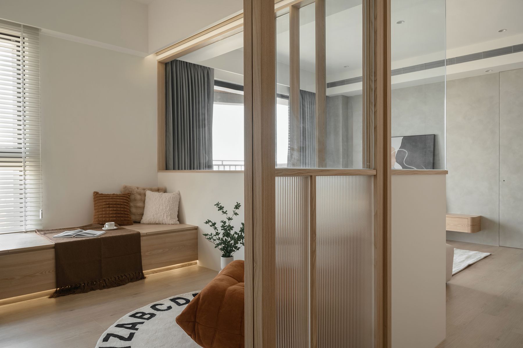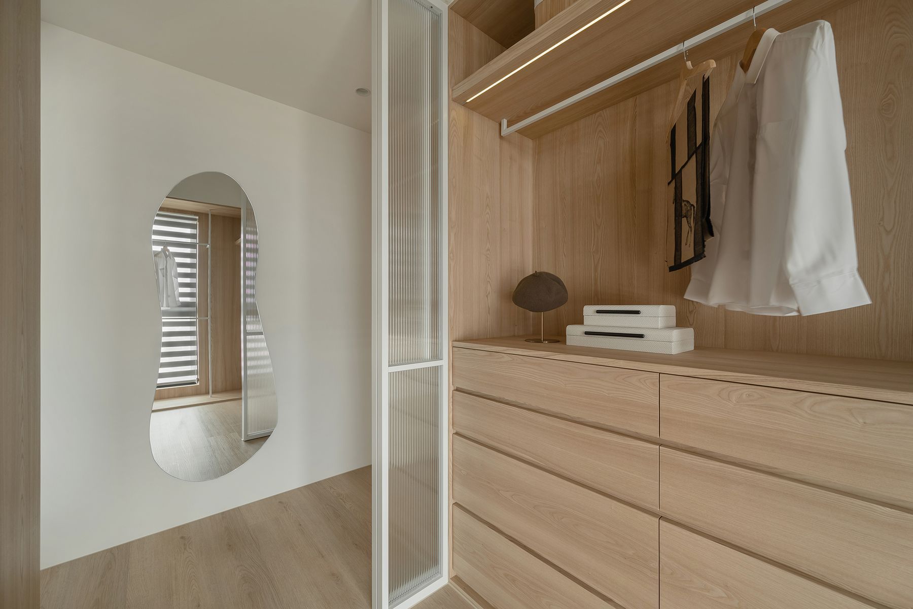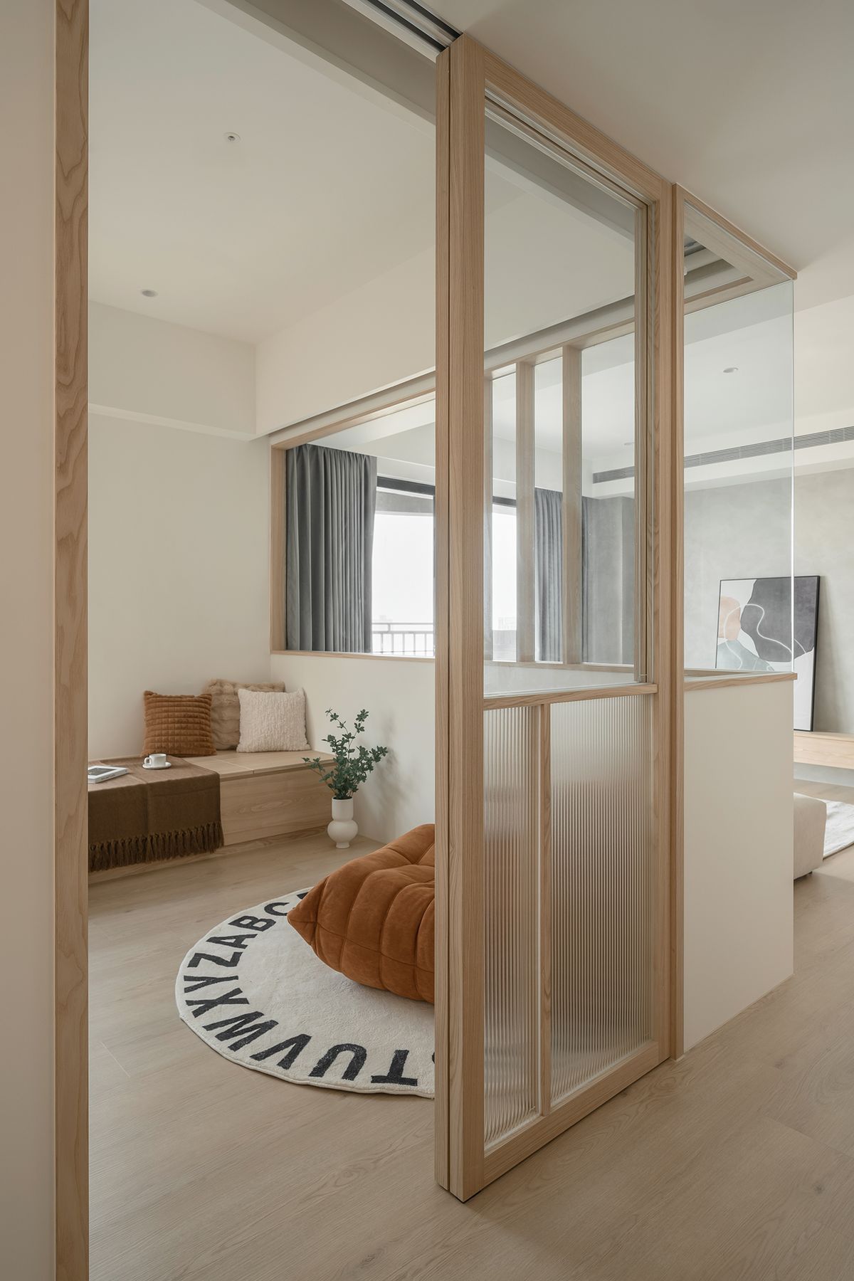 空間以溫暖的原色橡木,與大面積白色為基底,呼應起居者單純且樂活的生活態度。客廳為生活場域的中心,並依其動線前後發展出主臥室、更衣室、書房,與客房,使每個空間都得以浸泡於日光之中,將單面採光的狹長格局的劣勢化為優勢。懸吊的壁櫃、開放的層板、穿透的玻璃門片,看似「不做滿」的設計,卻使空間流動性與室內視線皆得以通透,達成高坪效的同時,更顧及小空間的視覺體感,讓居住者成為生活場域的主宰。