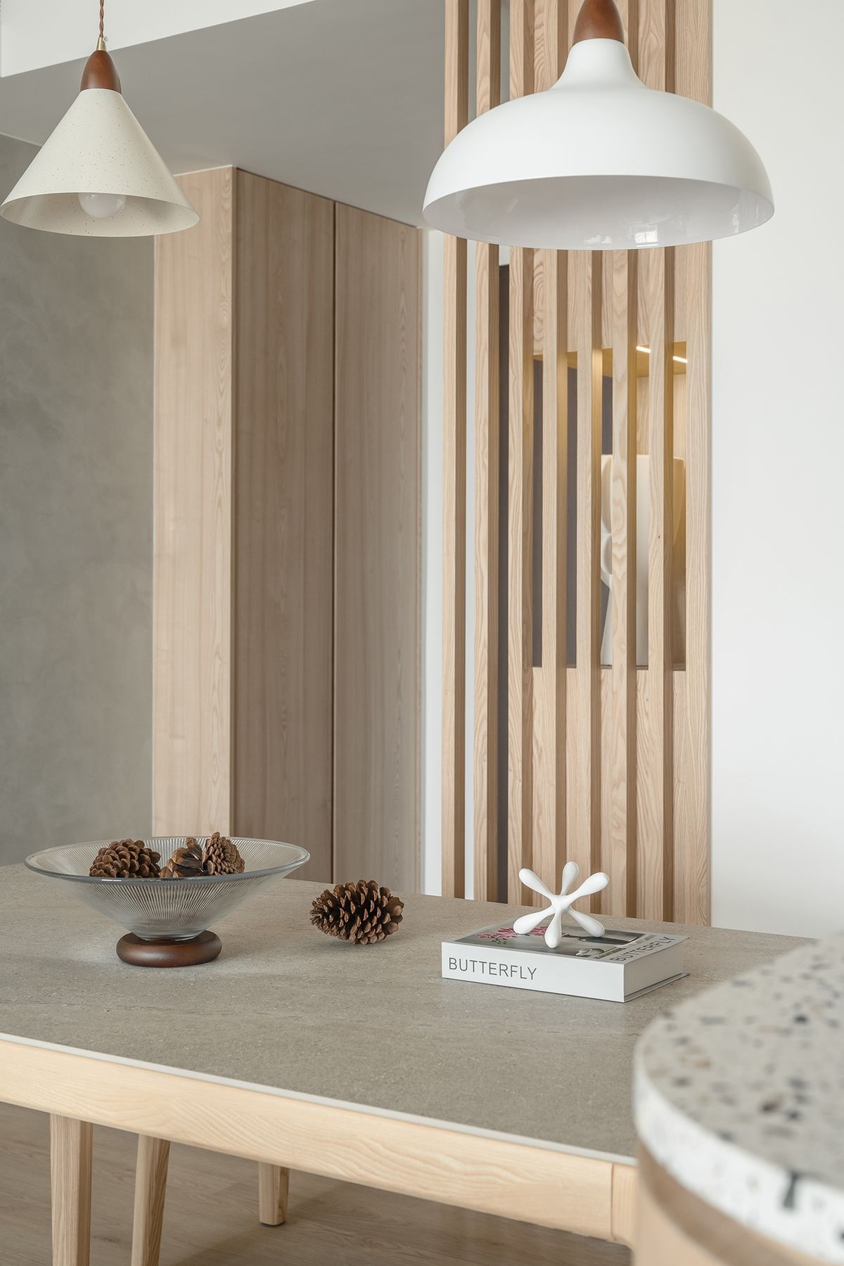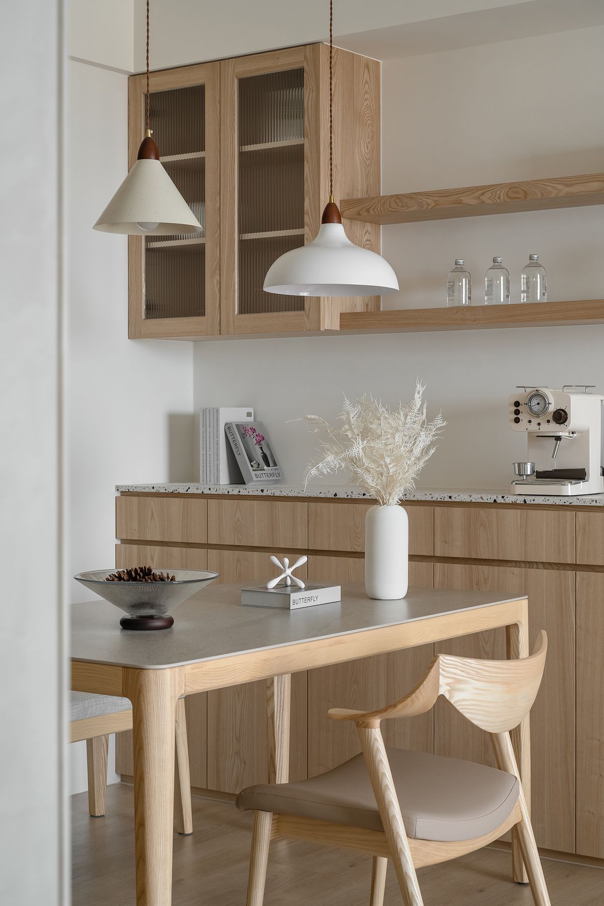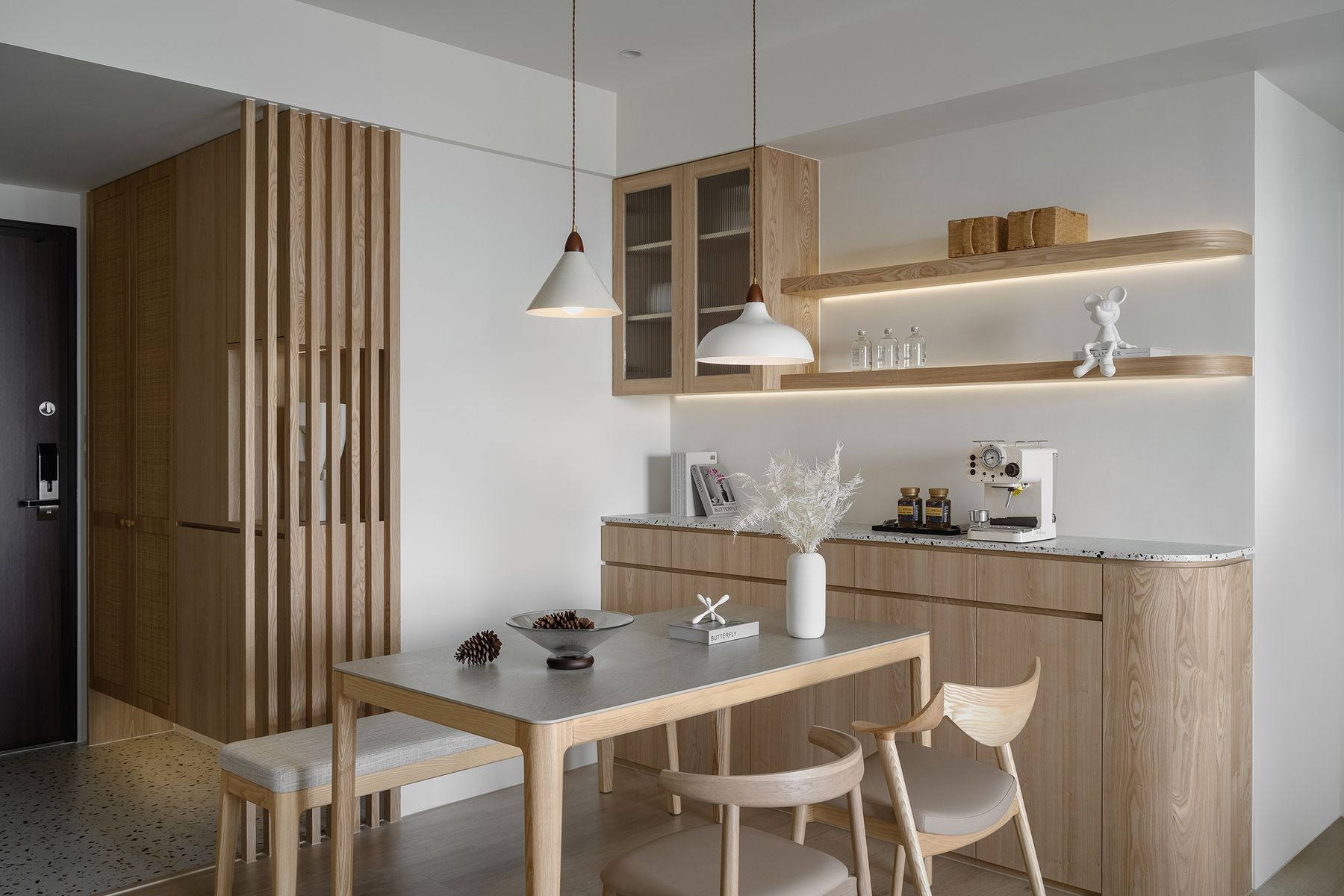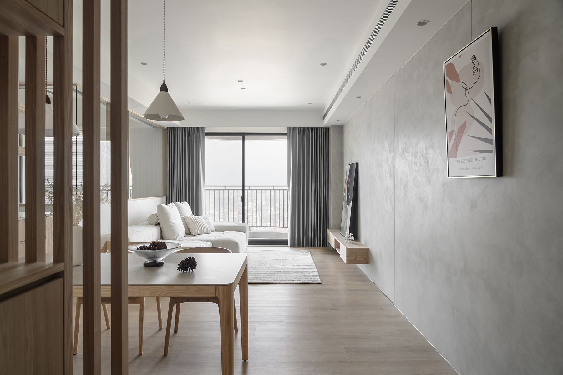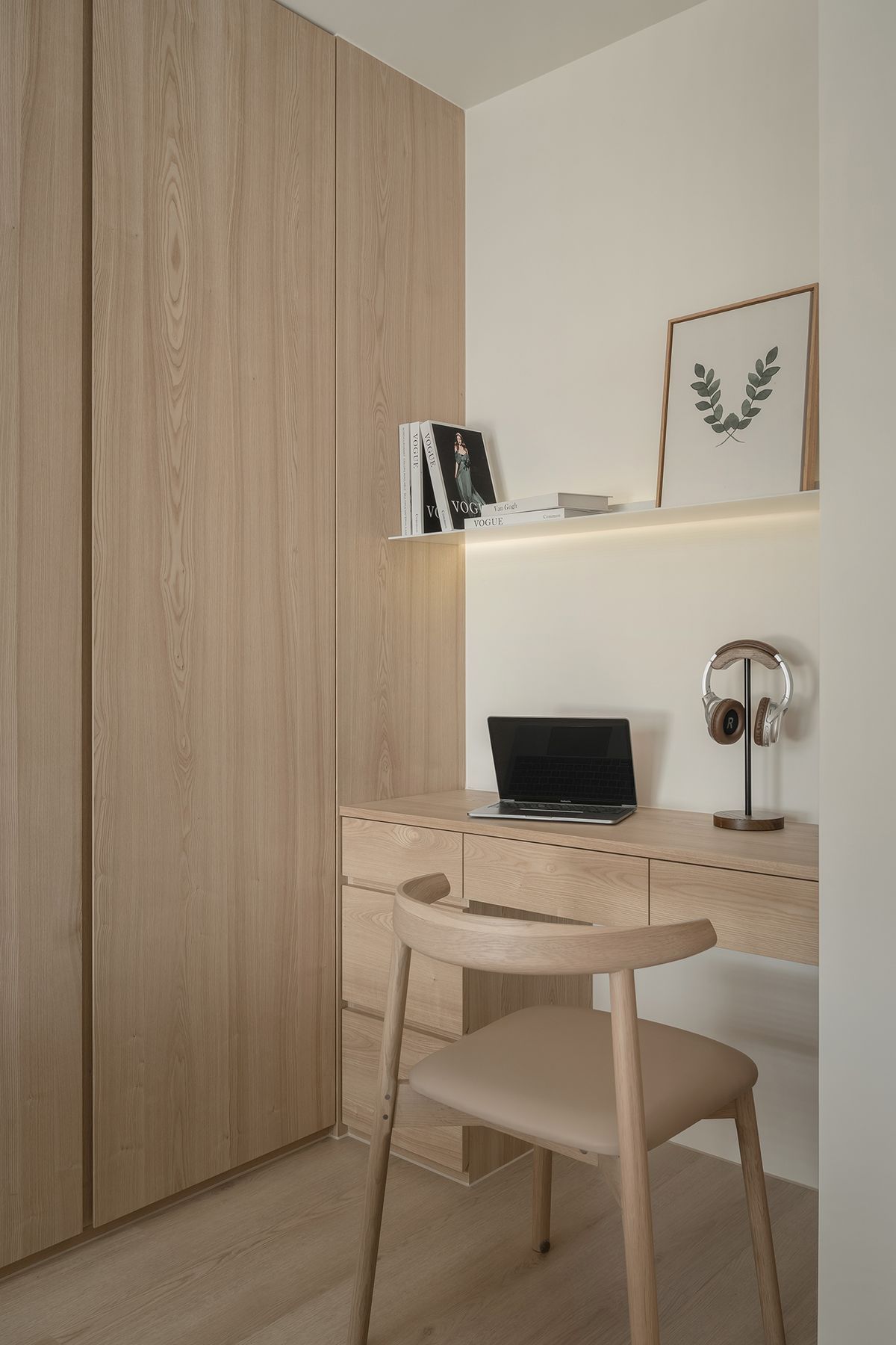 空間以溫暖的原色橡木,與大面積白色為基底,呼應起居者單純且樂活的生活態度。客廳為生活場域的中心,並依其動線前後發展出主臥室、更衣室、書房,與客房,使每個空間都得以浸泡於日光之中,將單面採光的狹長格局的劣勢化為優勢。懸吊的壁櫃、開放的層板、穿透的玻璃門片,看似「不做滿」的設計,卻使空間流動性與室內視線皆得以通透,達成高坪效的同時,更顧及小空間的視覺體感,讓居住者成為生活場域的主宰。