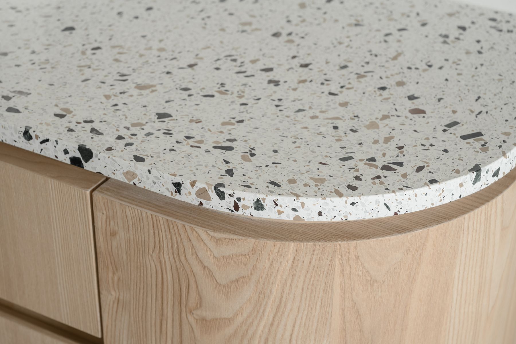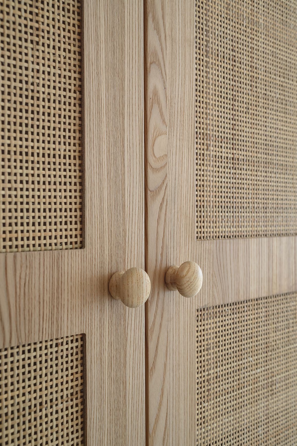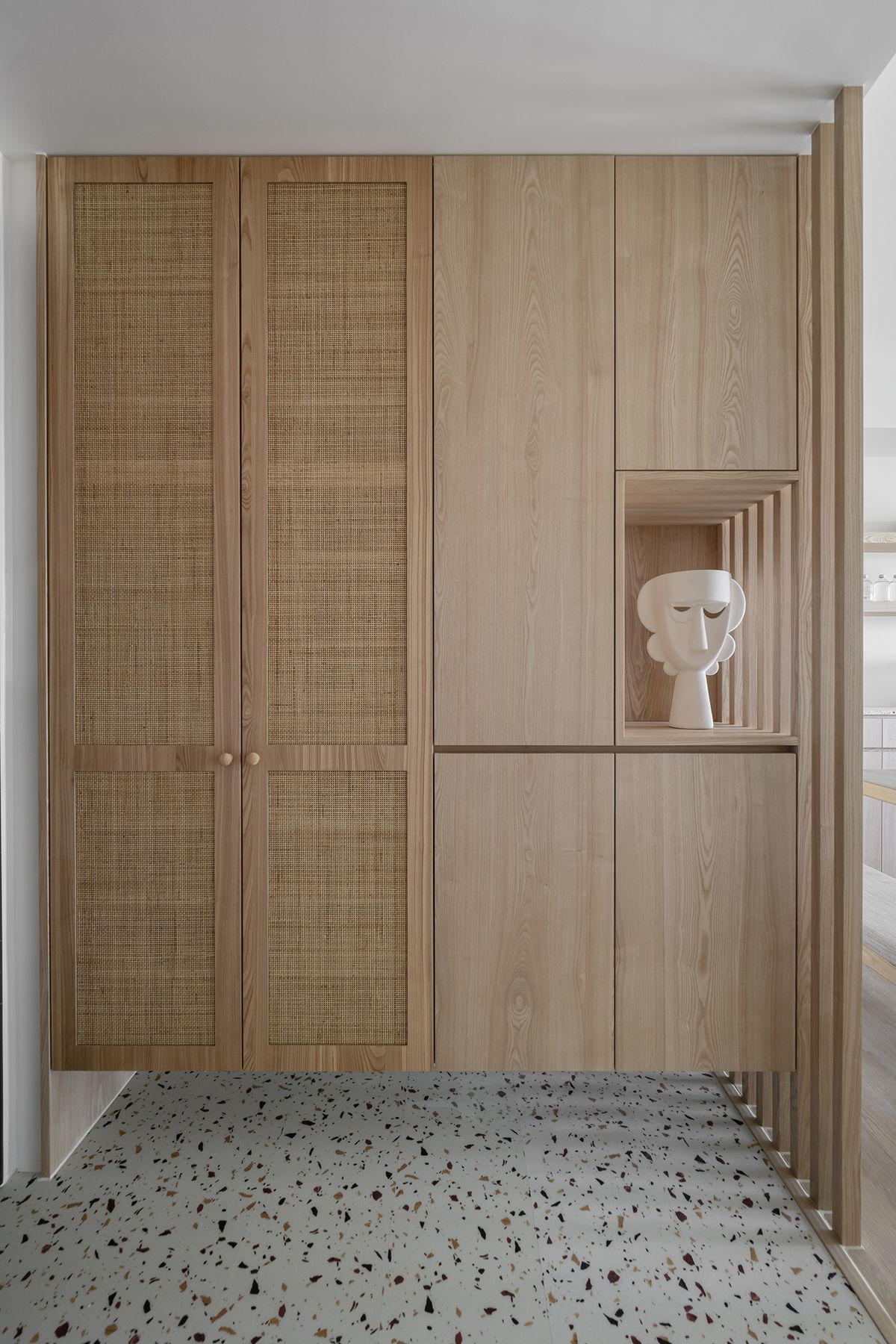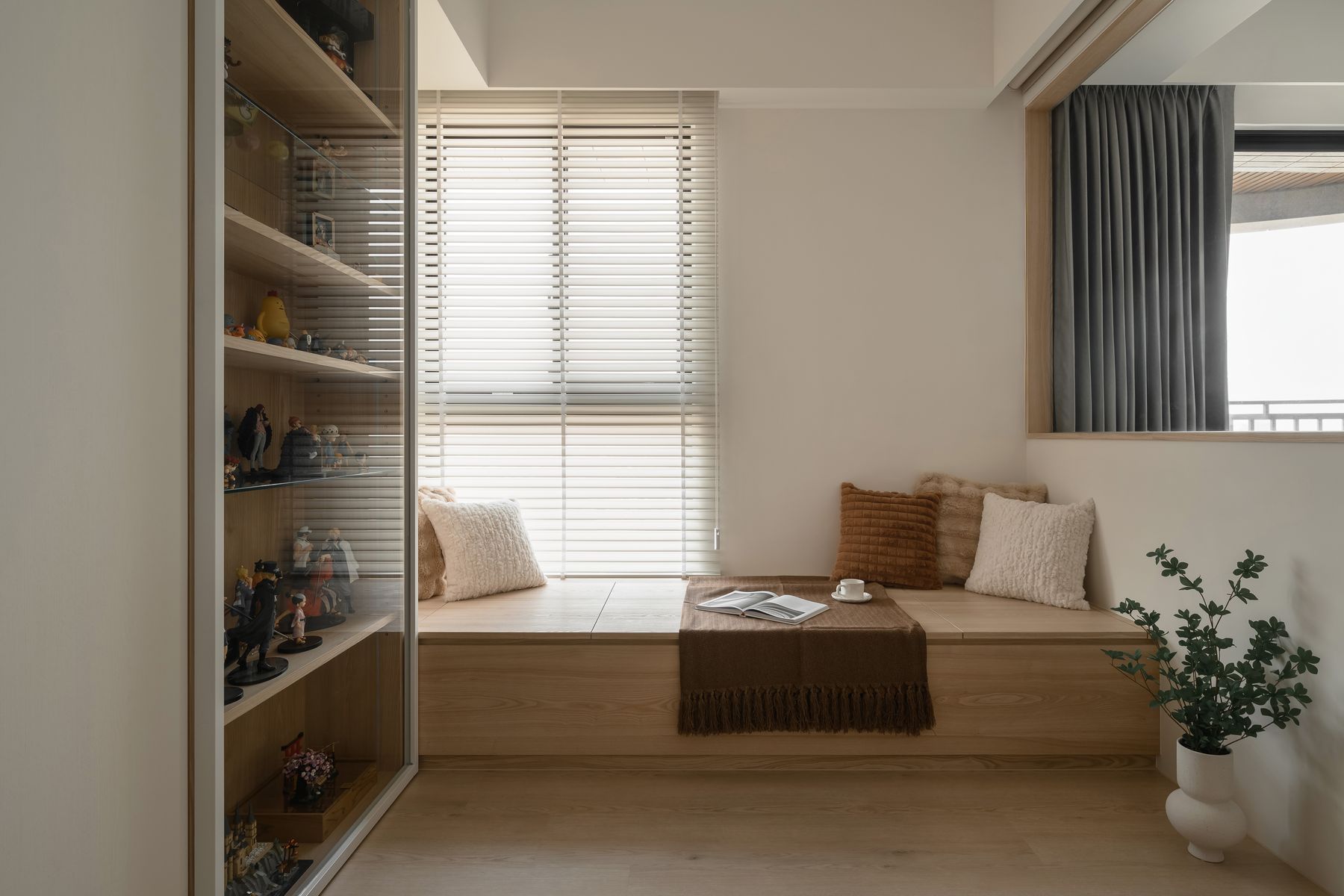 空間以溫暖的原色橡木,與大面積白色為基底,呼應起居者單純且樂活的生活態度。客廳為生活場域的中心,並依其動線前後發展出主臥室、更衣室、書房,與客房,使每個空間都得以浸泡於日光之中,將單面採光的狹長格局的劣勢化為優勢。懸吊的壁櫃、開放的層板、穿透的玻璃門片,看似「不做滿」的設計,卻使空間流動性與室內視線皆得以通透,達成高坪效的同時,更顧及小空間的視覺體感,讓居住者成為生活場域的主宰。