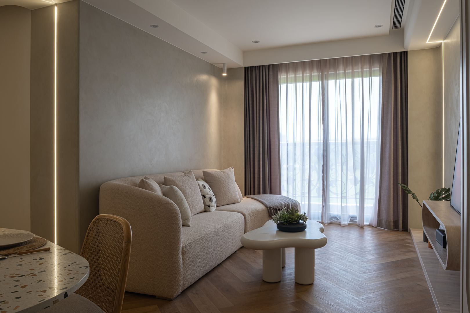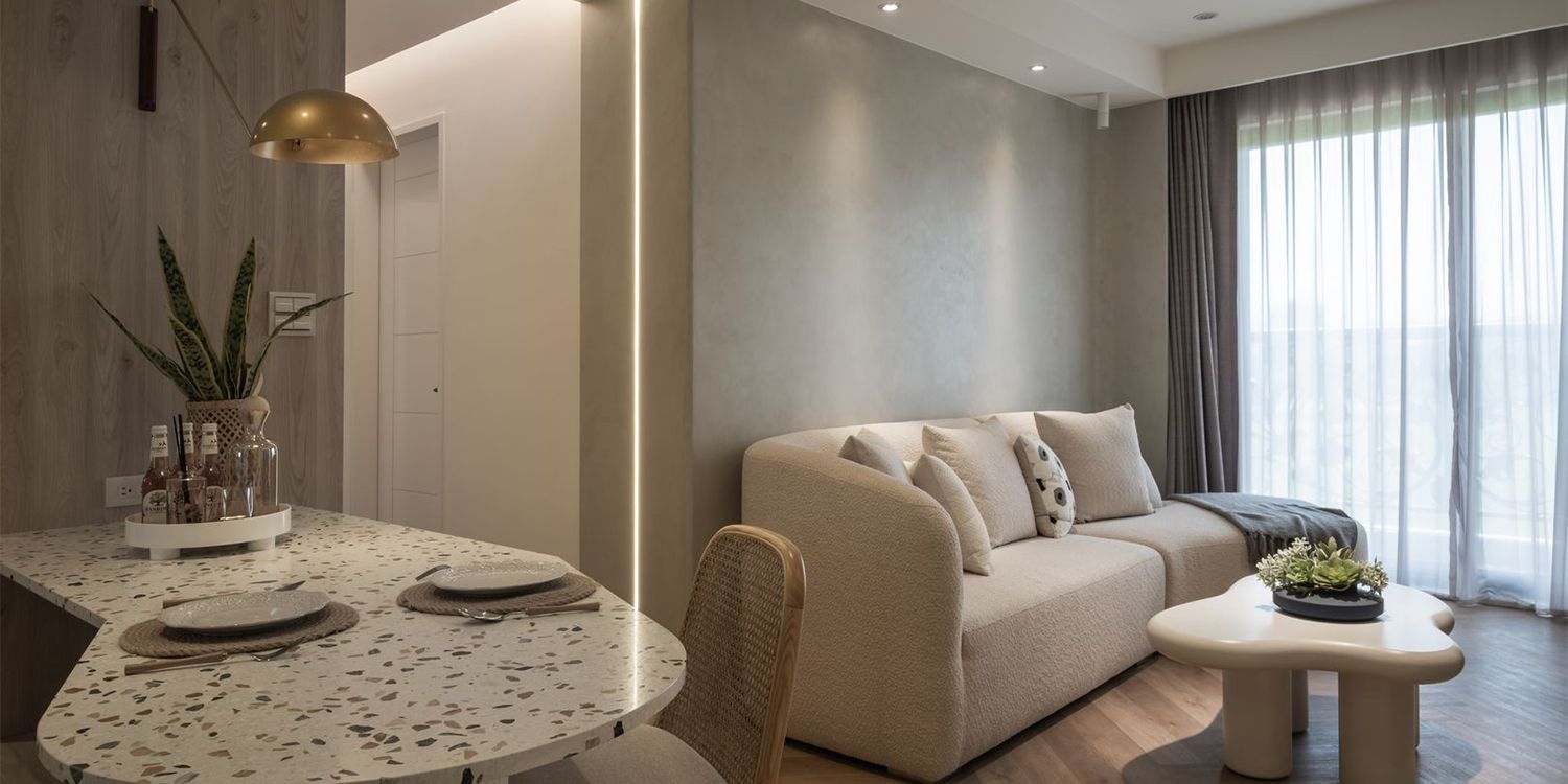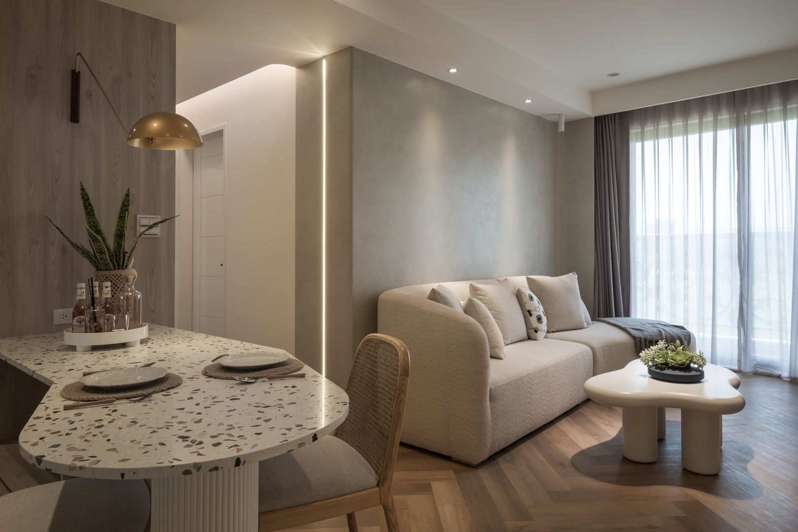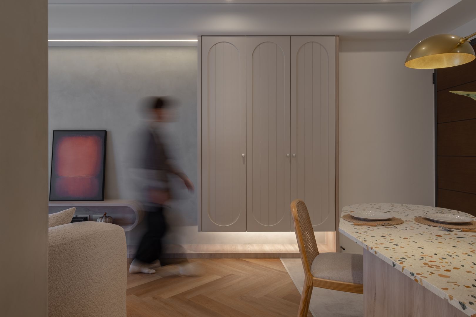圓與弧散落於20坪的格局各處,並以柔白的裸色系調和全室空間,再以條燈的行徑勾勒出氛圍與情調,將二房小宅幻化成風格場域。餐桌由水磨石與羅馬柱混搭構成,同時借鏡開放式中島的概念,桌面自壁面以斜角向外延伸,形成收納與造型兼具的複合式餐桌。人字拼的木地板襯托北歐風格軟裝的樂活氣息,搭配整體色系的同時不失風情。