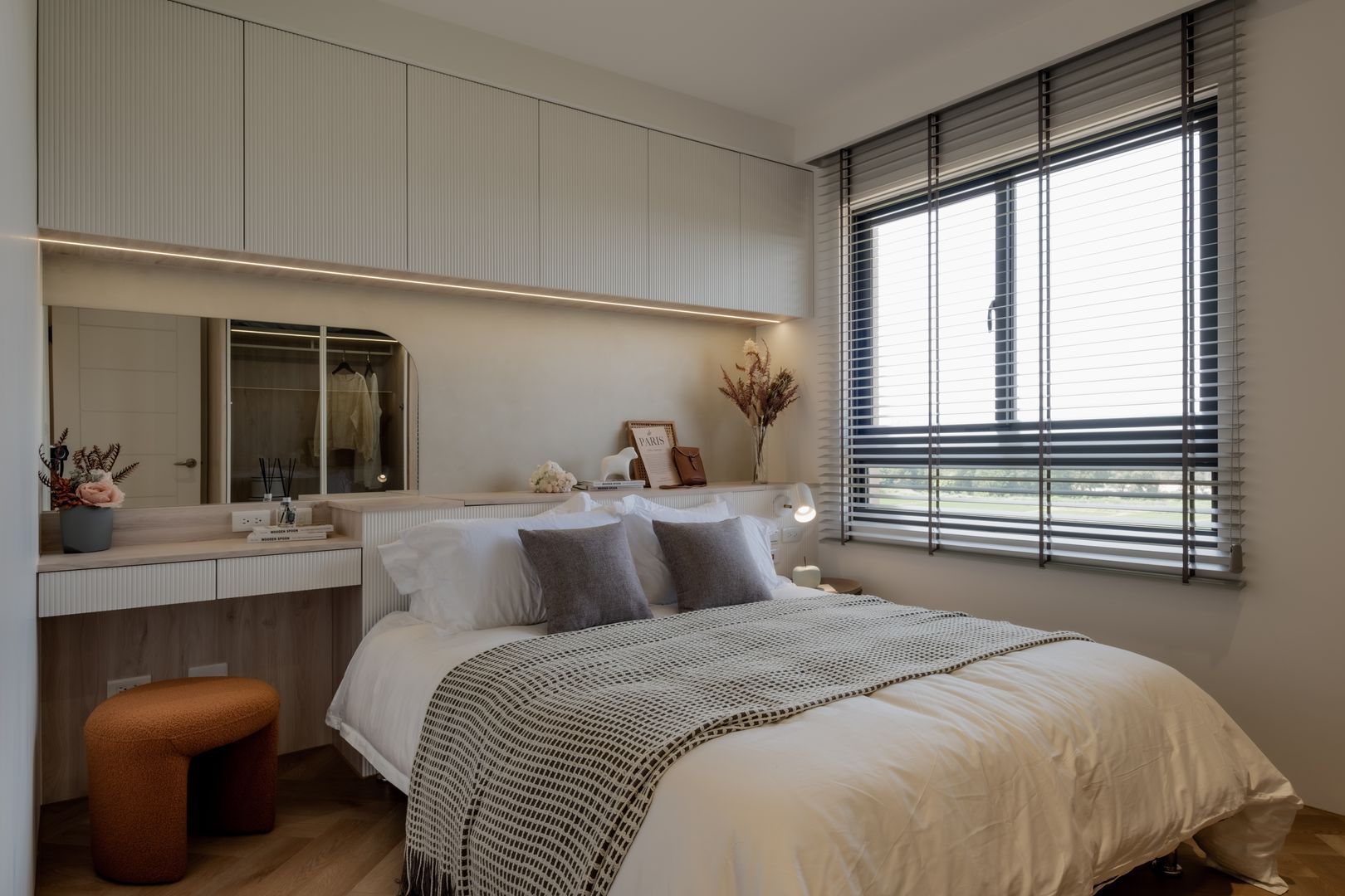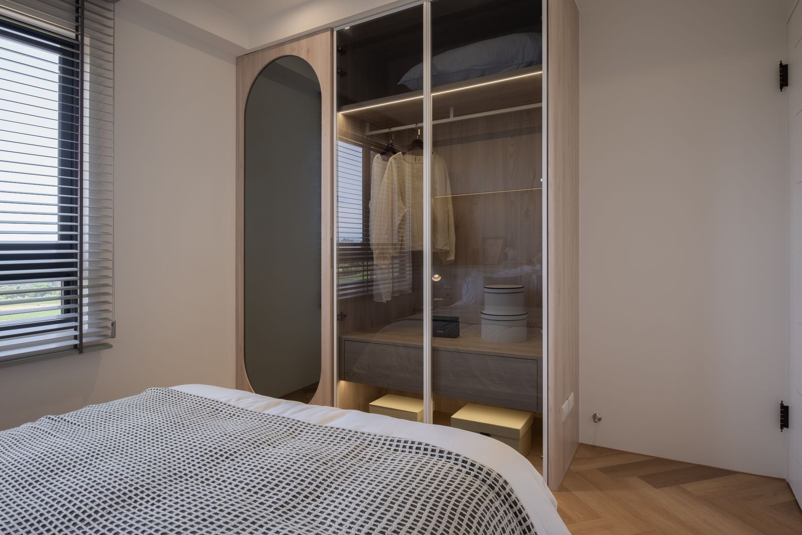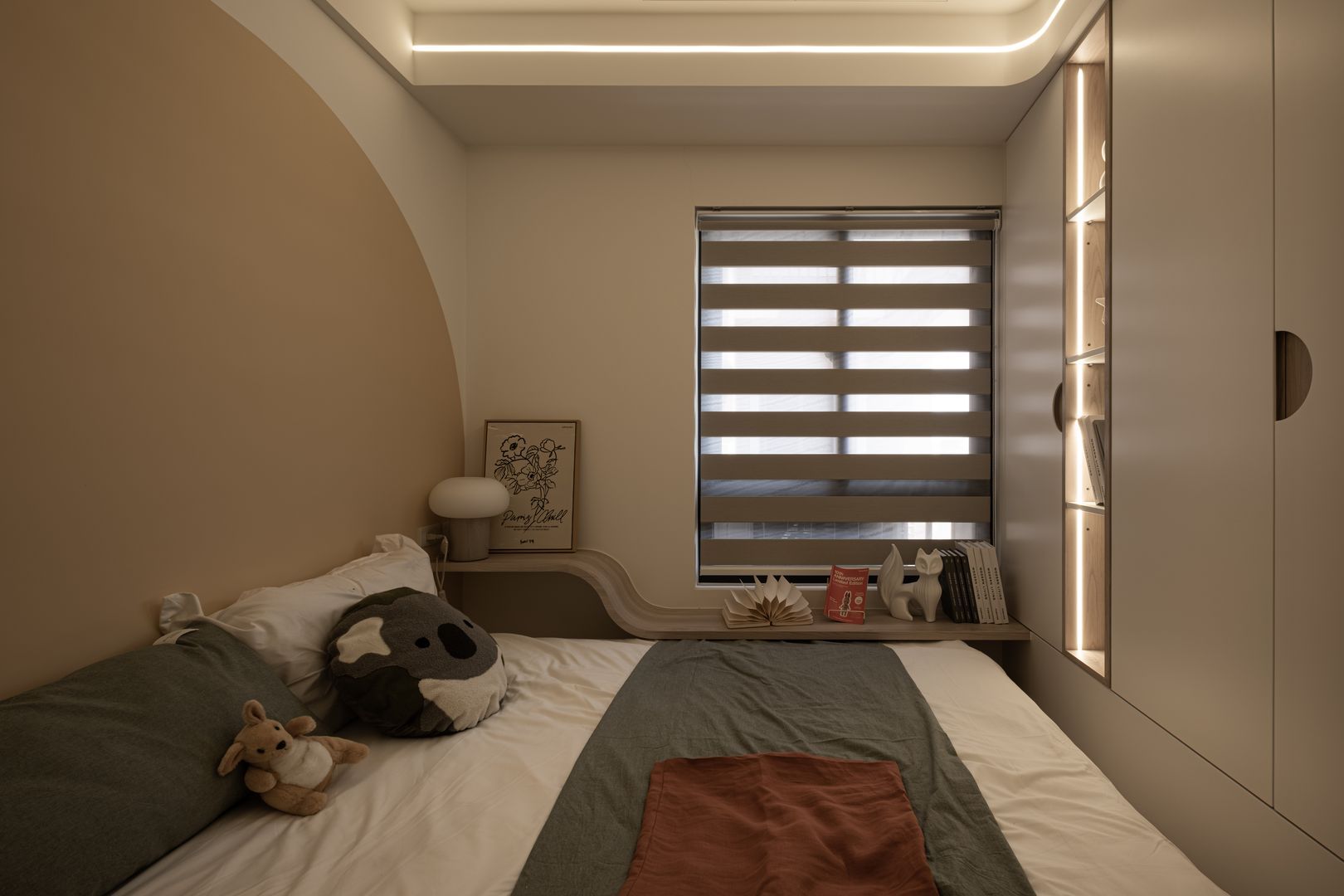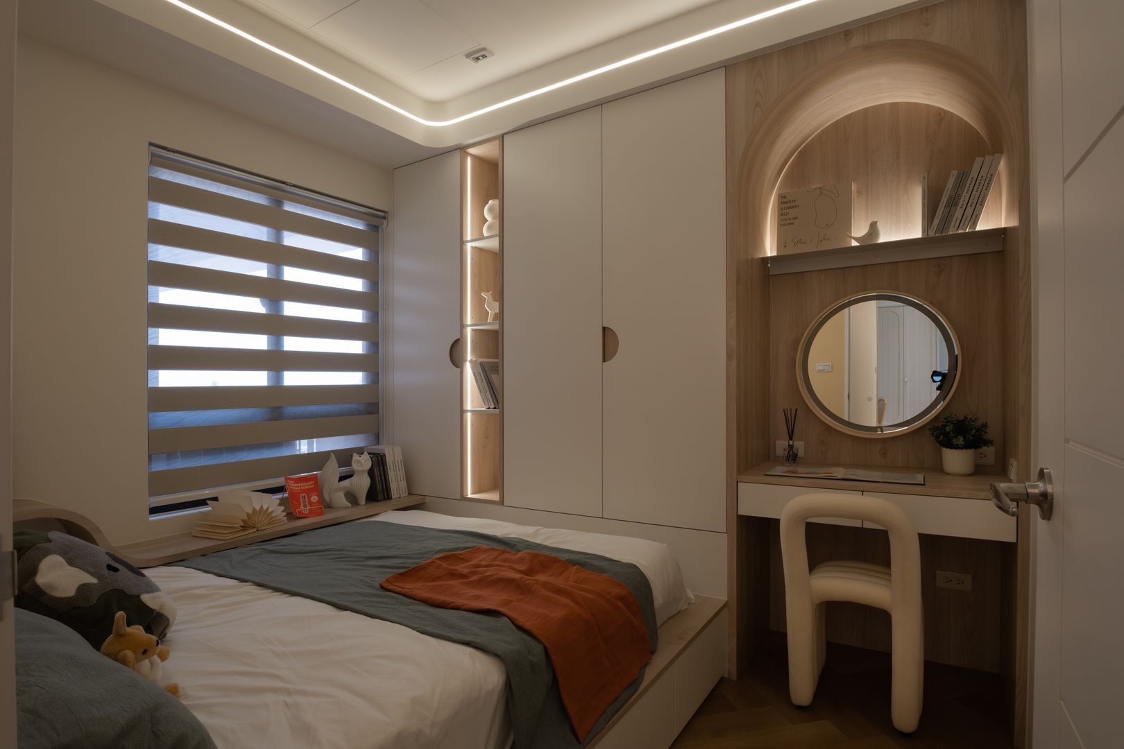 圓與弧散落於20坪的格局各處,並以柔白的裸色系調和全室空間,再以條燈的行徑勾勒出氛圍與情調,將二房小宅幻化成風格場域。餐桌由水磨石與羅馬柱混搭構成,同時借鏡開放式中島的概念,桌面自壁面以斜角向外延伸,形成收納與造型兼具的複合式餐桌。人字拼的木地板襯托北歐風格軟裝的樂活氣息,搭配整體色系的同時不失風情。